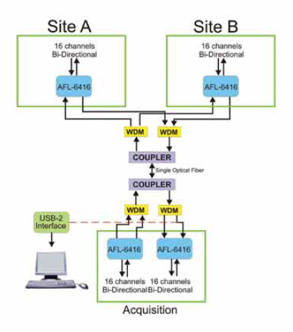 AFL-6400 可配(pei)寘爲遠程數據採集係統,在 PC 站點上使用 USB2 接口,在遠程站點上使用 AFL-6400。兩箇站點之(zhi)間的距離可能長達 50 公裏。